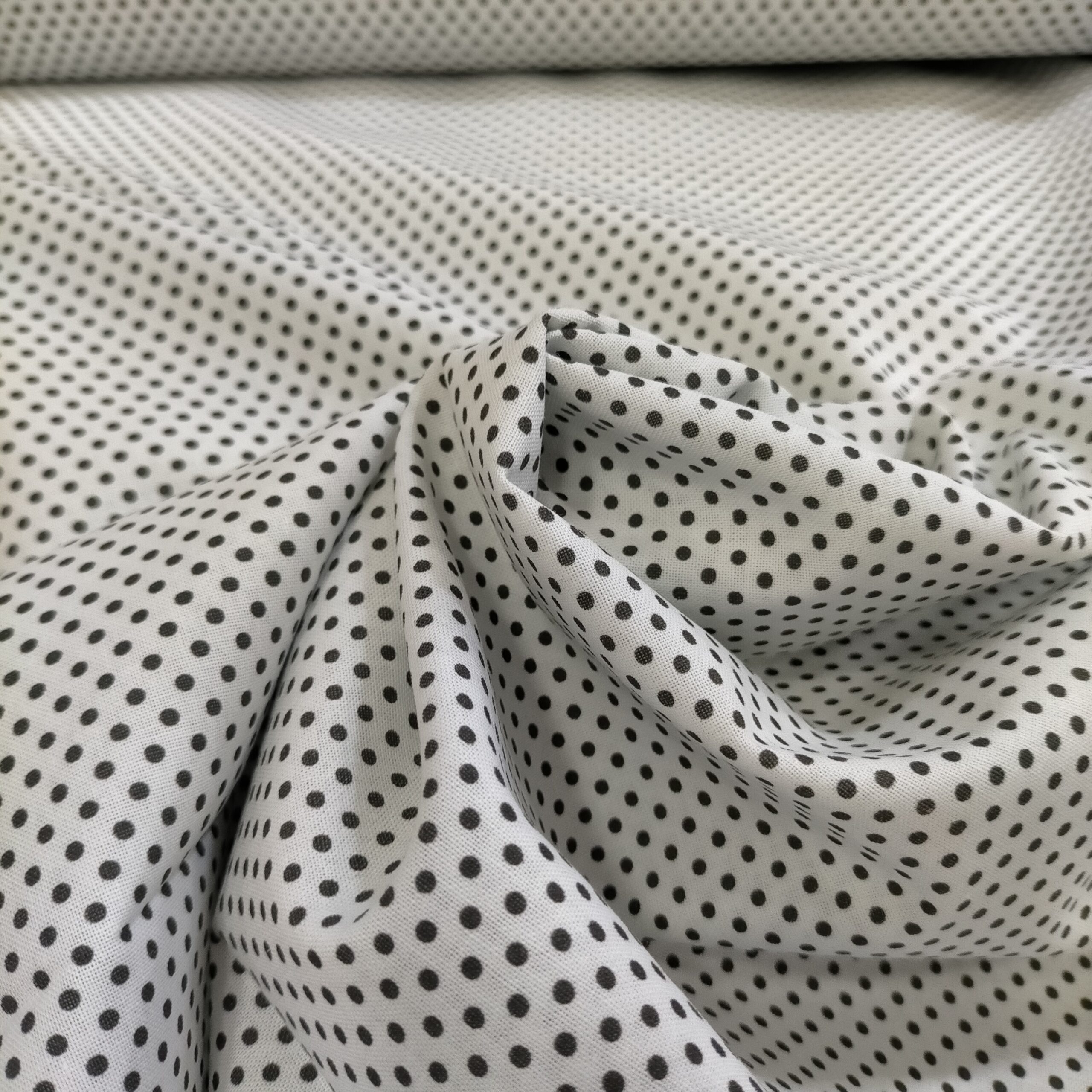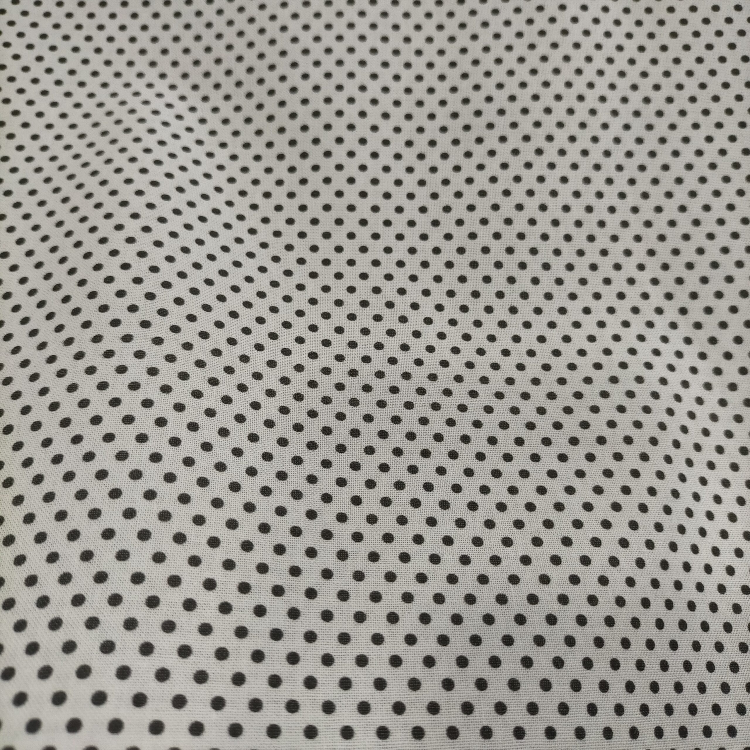 Tela algodón fondo blanco roto topos negros, el algodón es una fibra textil natural, la más utilizada en el mundo textil por sus propiedades, absorbe la humedad y expulsa el calor corporal, se tiñe muy bien, no genera electricidad estática, es aislante y soporta altas temperaturas.