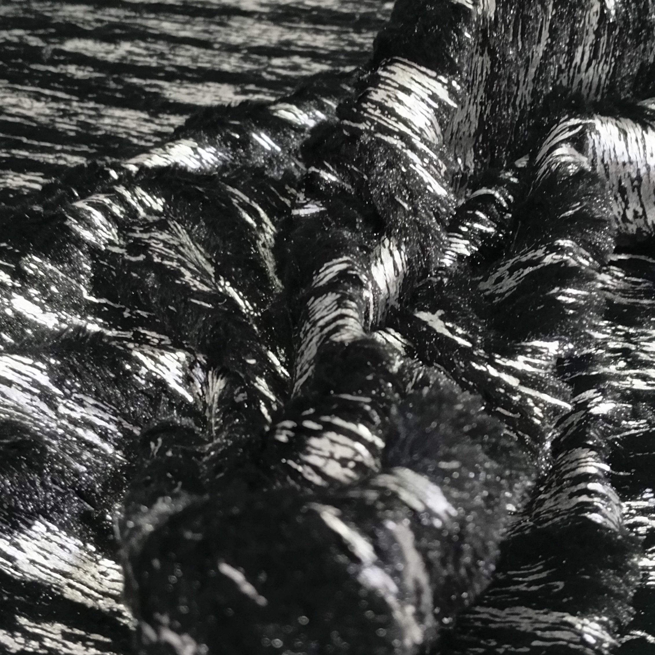 Tela de pelo sintético Morgana, es un tejido con dos caras, su cara principal es una especie de vello sedoso, brillante, con hilos cortados que son más largos y menos compactos que la del terciopelo. El pelo ANEU es ideal para cualquier confección de otoño e invierno como abrigos, chalinas, chaquetas y cualquier prenda sofisticada de moda. Nuestro pelo sintético Morgana viene en color negro con mechones en plata.